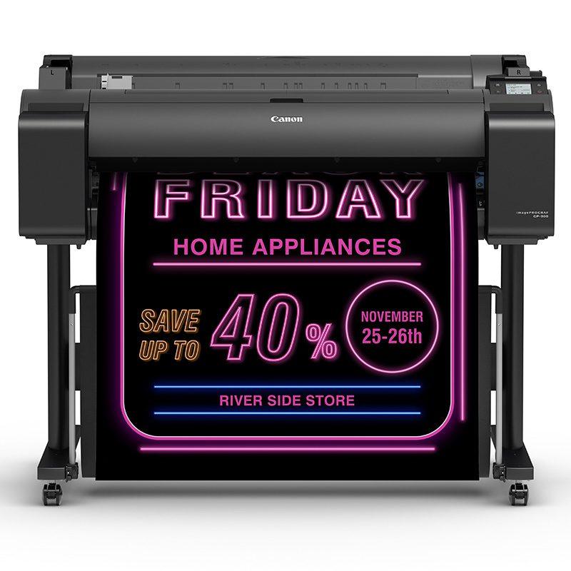 Canon imagePROGRAF GP-300 — 36″ large-format printer featuring Fluorescent Pink ink and Radiant Infusion technology for vibrant, borderless posters and in-house marketing displays.