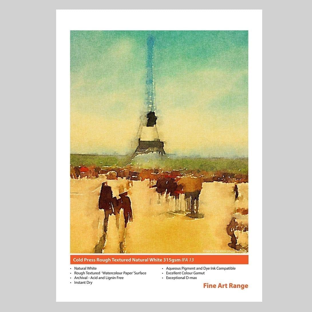 Cold Press Rough Textured Natural White 315gsm IFA 13 is a Fourdrinier, acid-free, museum quality paper with a natural white finish and rough ‘watercolour’ textured surface.